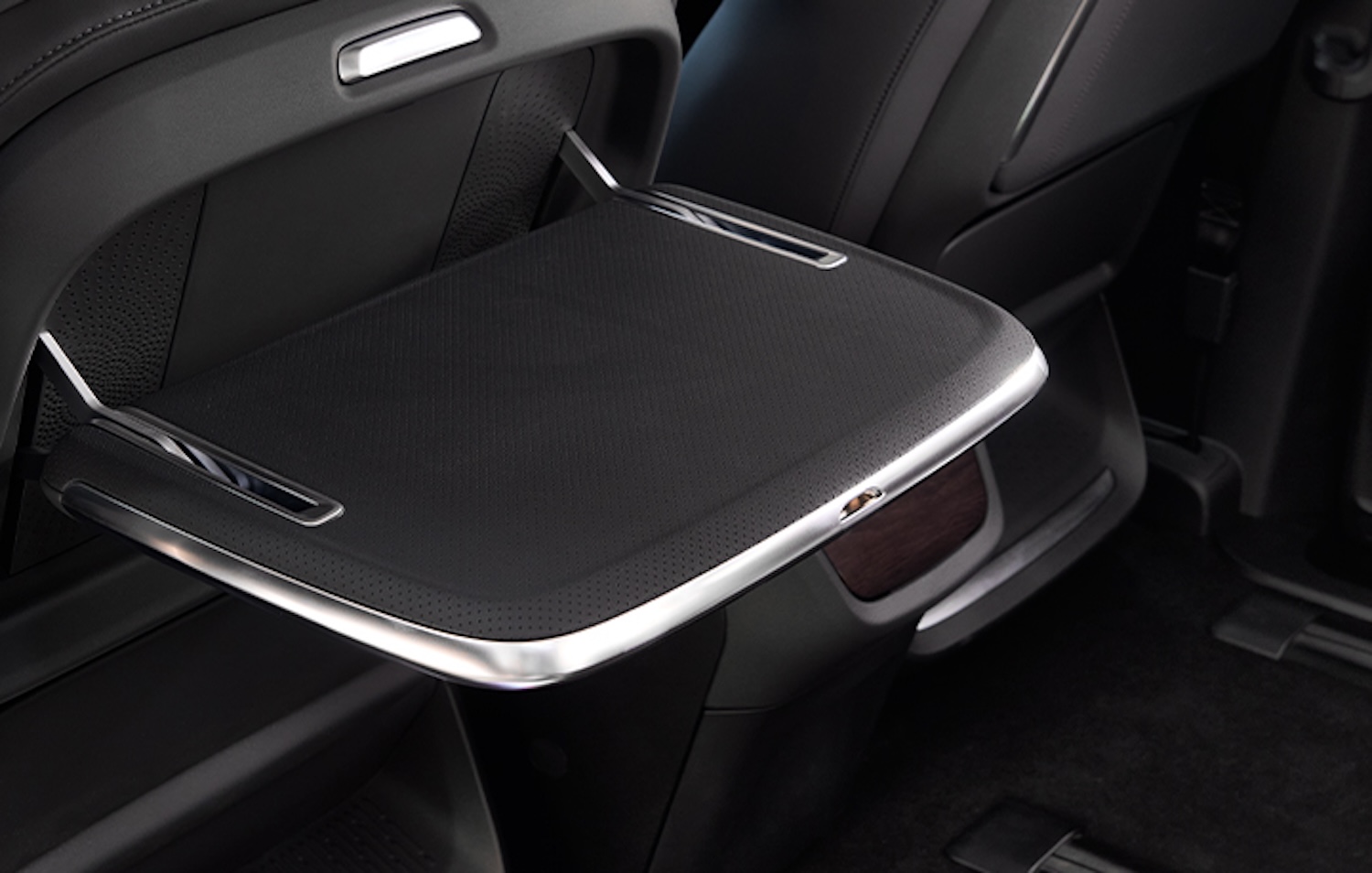 Second-row VIP Captain Seats (V and PLUS trims) with memory, massage, and heating/cooling functions controllable through armrest touchscreen display. The seats also feature smartphone holders, foldable desks, and glass holders.